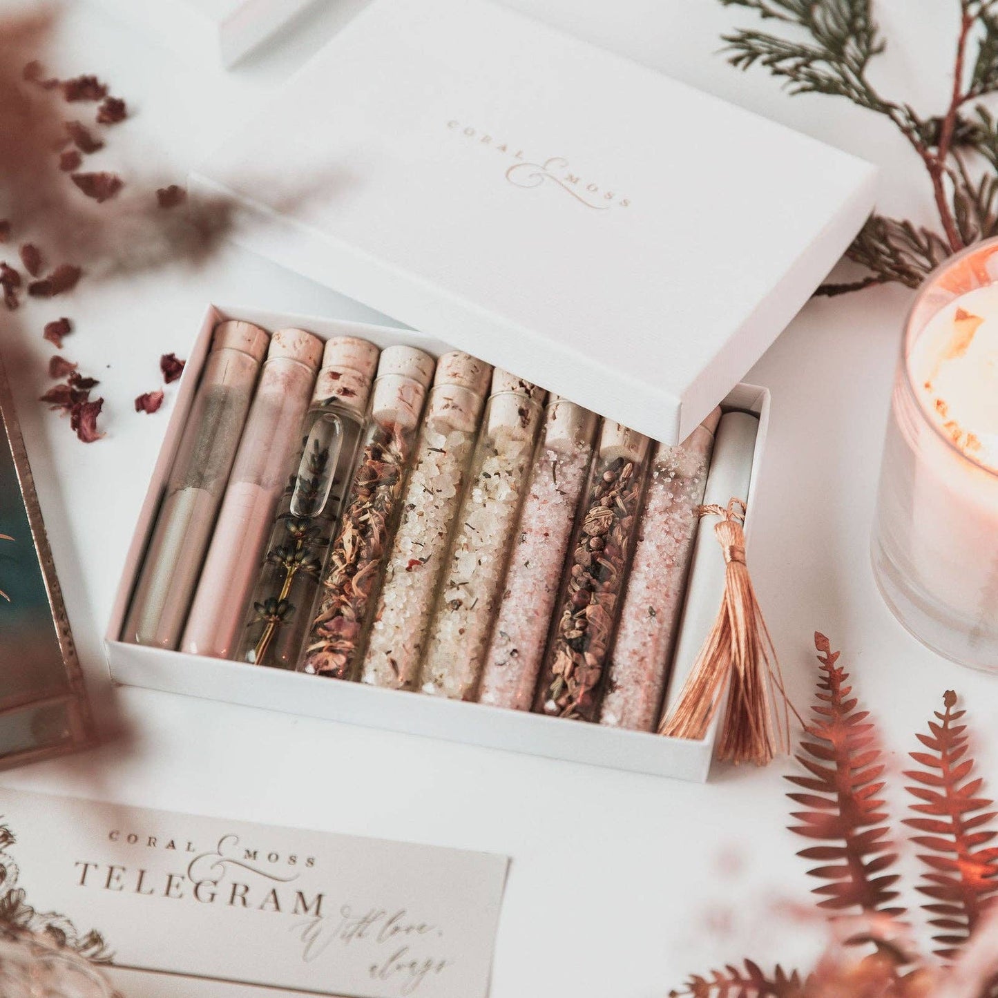 The Petite Apothecary Gift Set features 100% natural ingredients for a complete self-care ritual. Includes clay masks, body oil, botanical steams, and bath salts to cleanse, hydrate, and relax - perfect for creating your own indulgent, mindful spa experience at home.